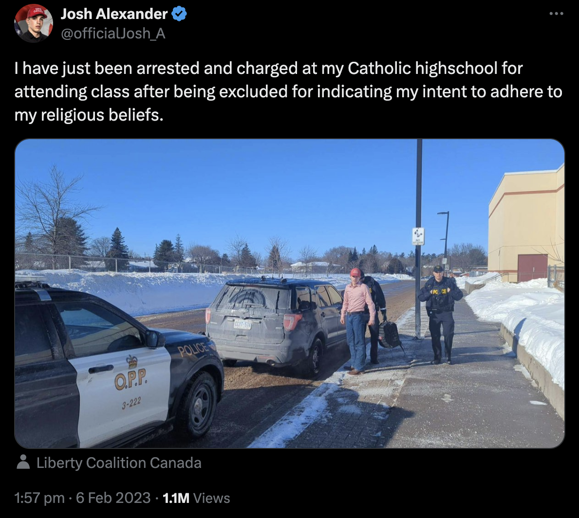 Alexander would later be arrested in February of 2023, a month after the suspension had been lifted, for trespassing — following the Renfrew County Catholic District School Board’s decision to “exclude” the 17-year-old Christian student from the remainder of the school year.