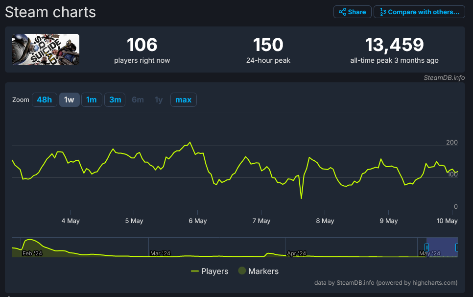 As of writing, the game’s player count currently sits at a 24-hour peak of just 150, with its monthly peak – just a little under three months after its release – sitting just barely higher at 591.