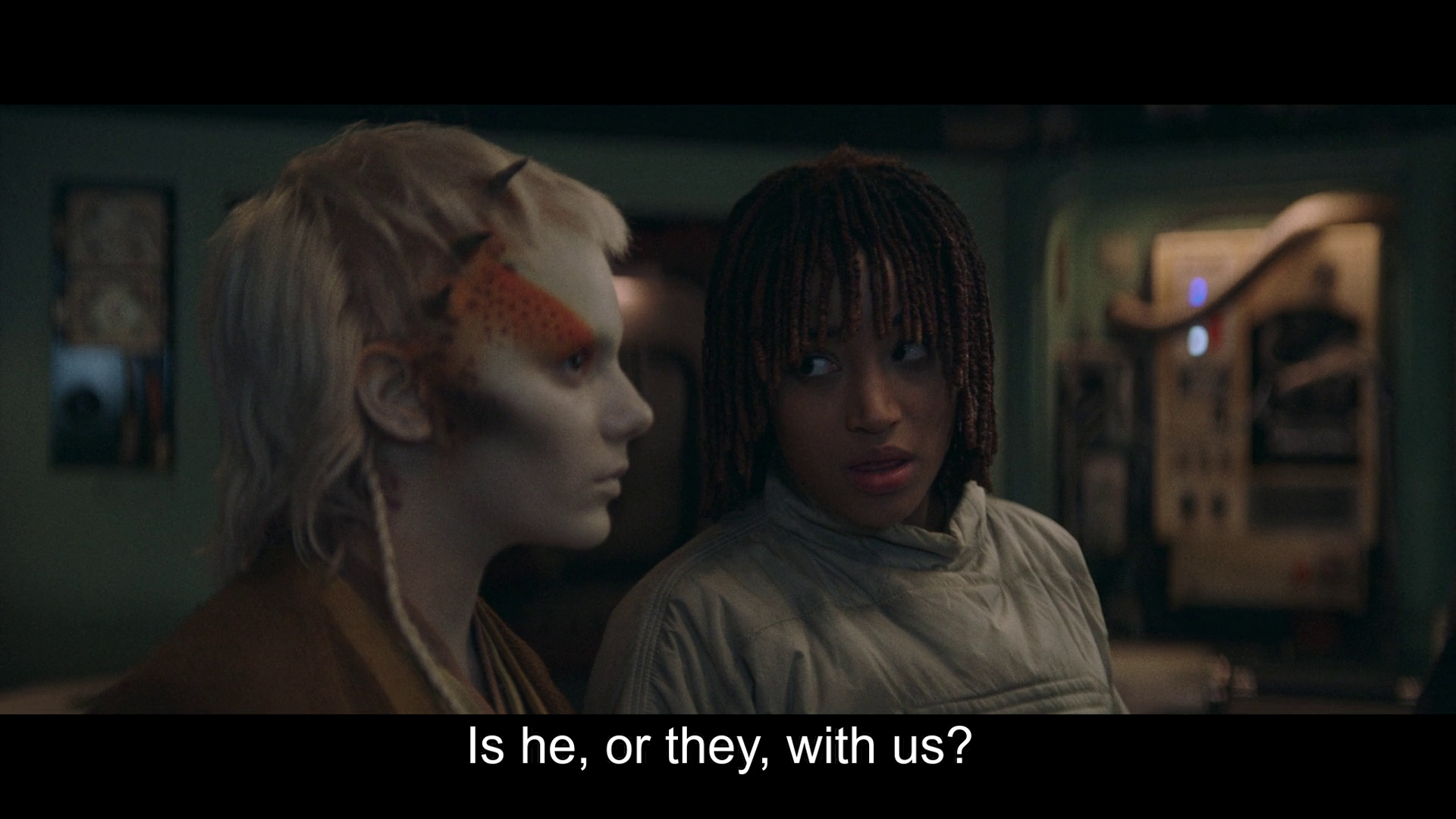 Still curious about her new acquaintance, Osha then begins to ask, “Is he-” before correcting herself “-or they, with us?”