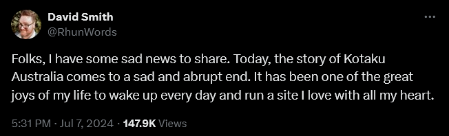“Folks, I have some sad news to share,” wrote former Kotaku AU managing editor David Smith. “Today, the story of Kotaku Australia comes to a sad and abrupt end. It has been one of the great joys of my life to wake up every day and run a site I love with all my heart.”