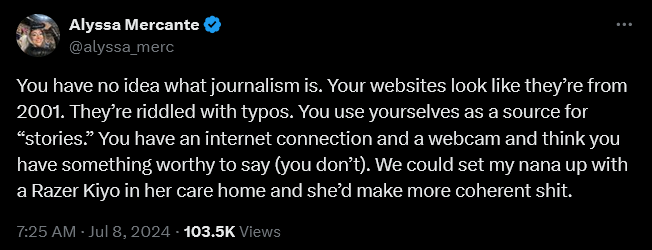“Your websites look like they’re from 2001,” said the Kotaku staffer. “They’re riddled with typos. You use yourselves as a source for ‘stories.’” You have an internet connection and a webcam and think you have something worthy to say (you don’t). We could set my nana up with a Razer Kiyo in her care home and she’d make more coherent shit.”