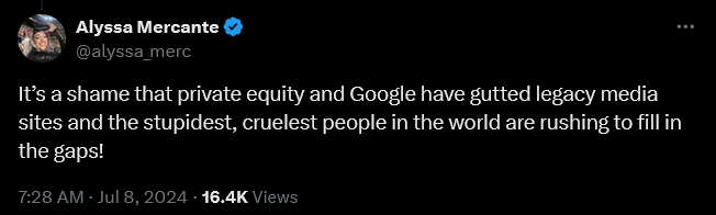 Closing out her thoughts, Mercante ultimately concluded, “It’s a shame that private equity and Google have gutted legacy media sites and the stupidest, cruelest people in the world are rushing to fill in the gaps!”