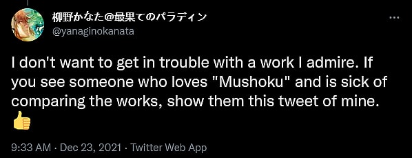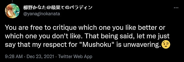 “I don’t want to get in trouble with a work I admire,” he further explained. “If you see someone who loves ‘Mushoku’ and is sick of comparing the works, show them this tweet of mine.”