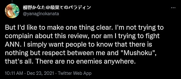 Eventually, after thanking English-speaking fans for their outpouring of support, Yanagino clarified, “I’d like to make one thing clear, I’m not trying to complain about this review, nor am I trying to fight ANN.”
