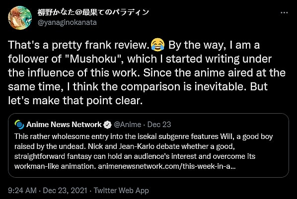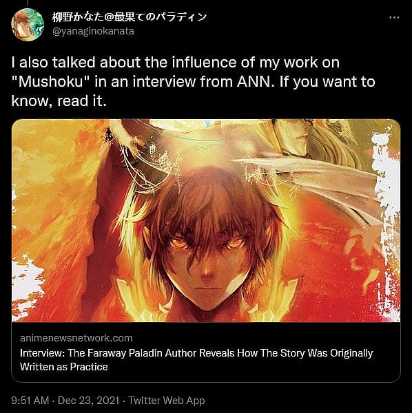 Yanagino then linked to his own interview with ANN Japan Correspondent Kim Morrissy, published just days earlier on December 13th, in which he “talked about the influence of my work on ‘Mushoku’”