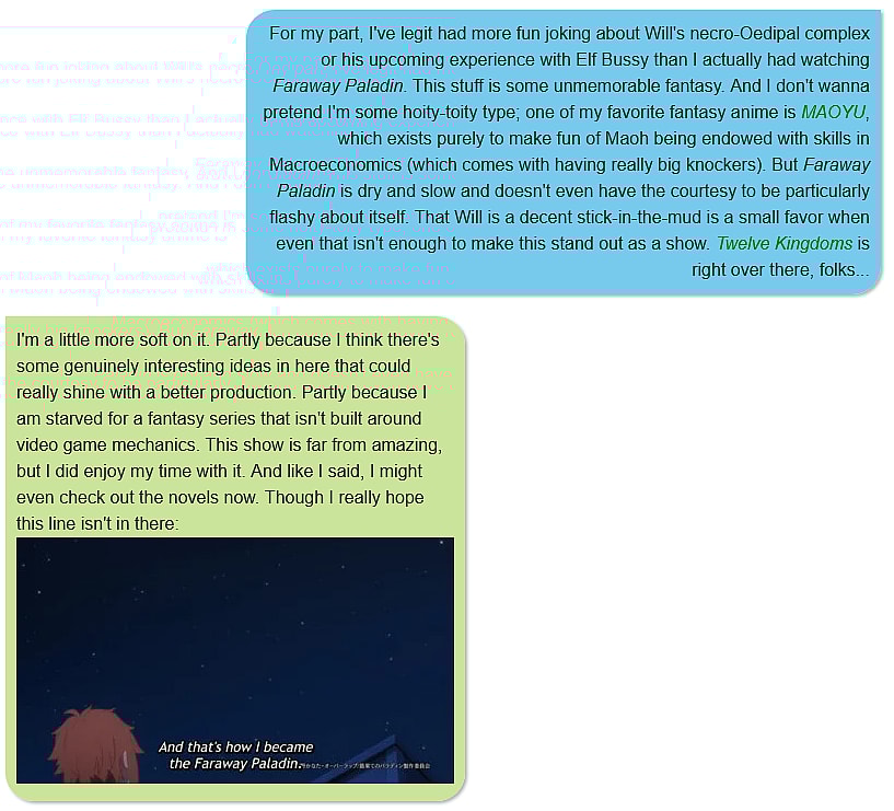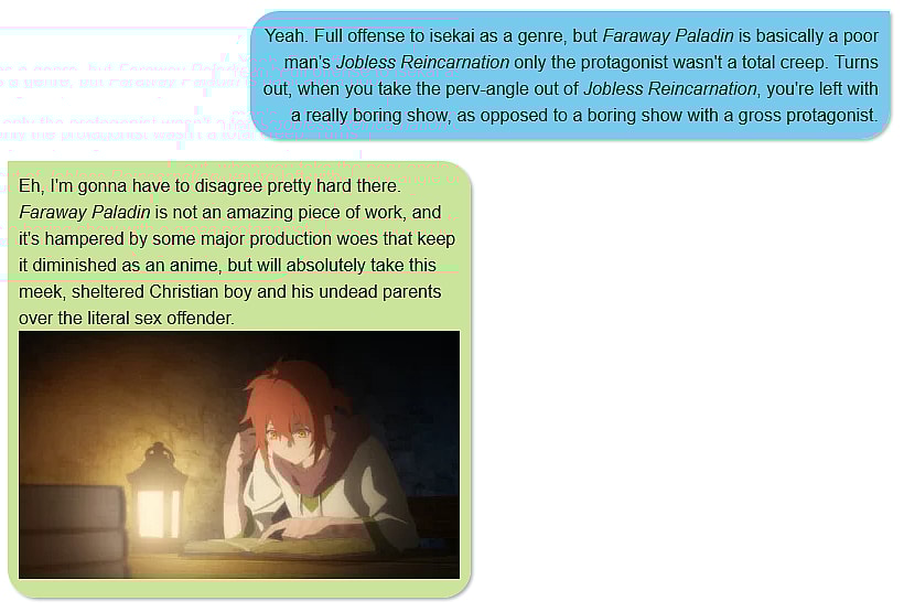 In turn, Lemus opined, “Yeah. Full offense to isekai as a genre, but Faraway Paladin is basically a poor man’s Jobless Reincarnation only the protagonist wasn’t a total creep.”