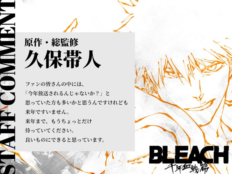 Apologizing via a statement published to the official Bleach website, Kubo explained, “I’m sure many fans were thinking, ‘Isn’t it going to be aired this year?’ I’m sorry, but it will be next year.”