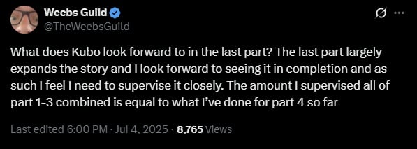 Therein, per a recap of the interview provided by panel attendee @TheWeebsGuild via their personal Twitter account, when faced with the same question regarding his most anticipated aspect of Part 4, Kubo asserted, “The last part largely expands the story and I look forward to seeing it in completion.”
