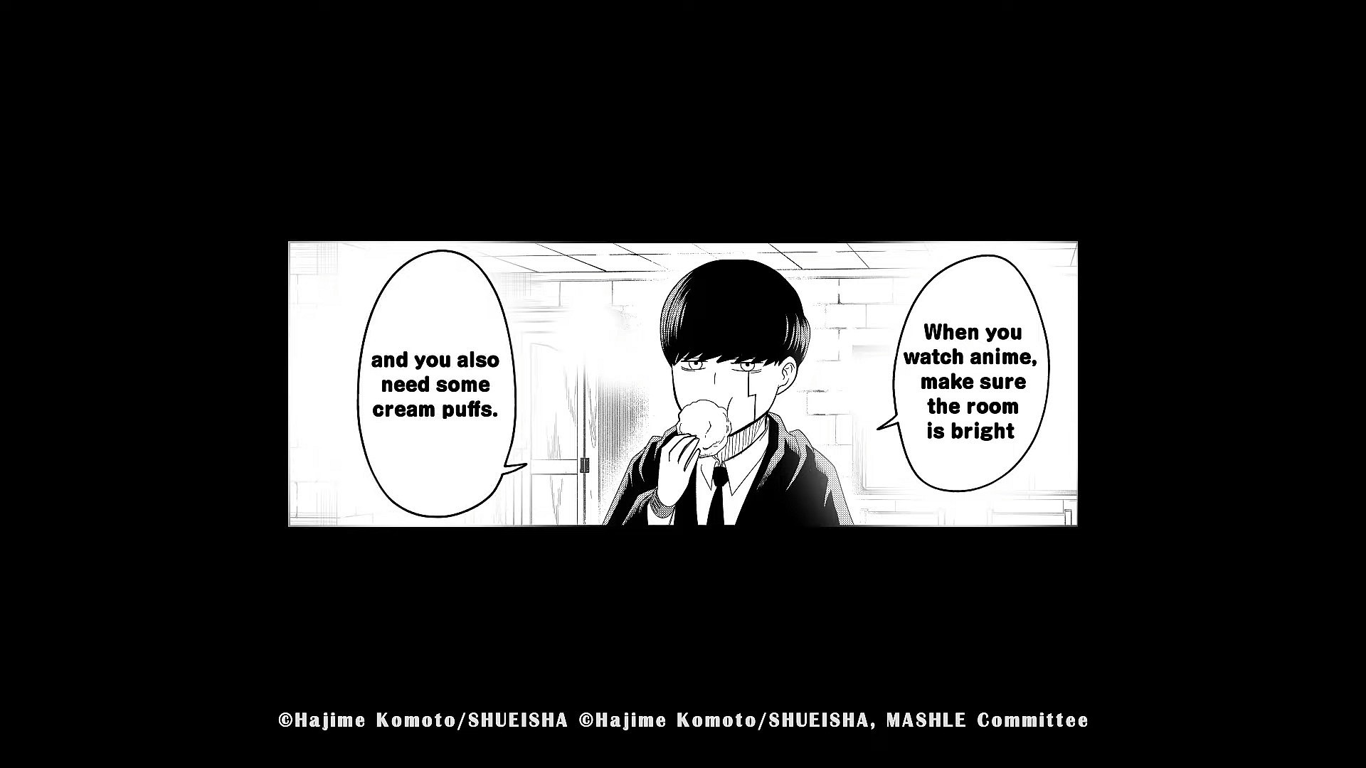 And finally a panel of Mashle eating his favorite snack and providing viewers with the brief PSA, “When you watch anime, make sure the room is bright and you also need some cream puffs.”