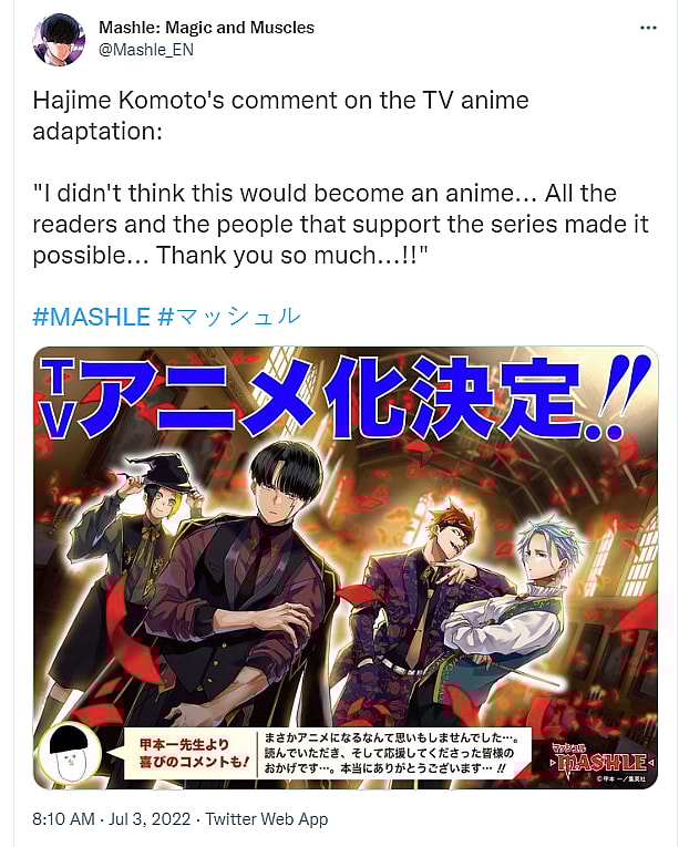 “I didn’t think this would become an anime,” said Komoto, as translated by the official English-language Mashle account. “All the readers and the people that support the series made it possible… Thank you so much…!!”