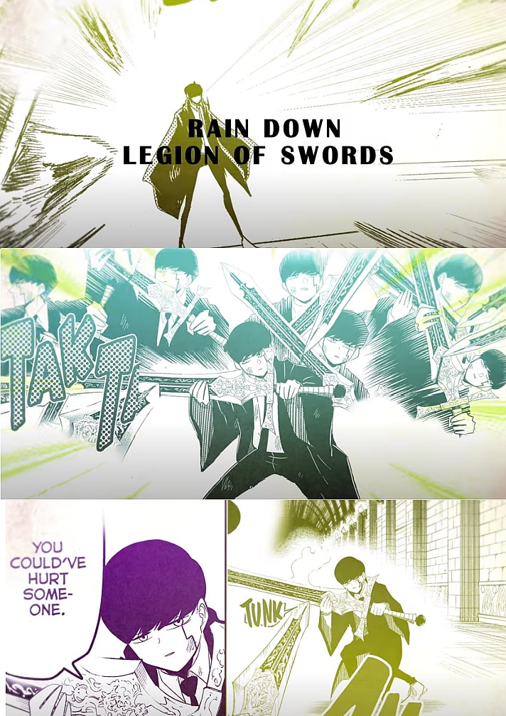 His physical prowess is exemplified in the next scene of the trailer, where faced with a spell sending countless swords raining down in his direction, Mashle uses nothing but a sword and his super strength to bunt the blades away.