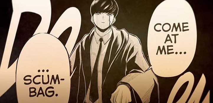 The trailer then concludes with a couple of panels from the Mashle: Muscles and Magic manga, the first being an aggressive and intimidating Mashle saying “Come at me, scumbag.”: