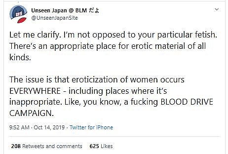 Unseen Japan would later add in a subsequent tweet, “Let me clarify. I’m not opposed to your particular fetish. There’s an appropriate place for erotic material of all kinds. The issue is that eroticization of women occurs EVERYWHERE – including places where it’s inappropriate. Like, you know, a fucking BLOOD DRIVE CAMPAIGN.”