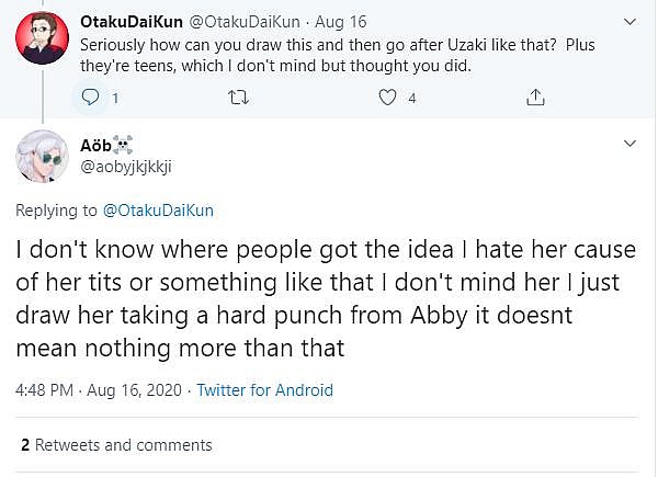 Aöb would later respond to a user saying, “I don’t know where people got the idea I hate her cause of her tits or something like that. I don’t mind her I just draw her taking a hard punch from Abby. It doesn’t mean nothing more than that.”