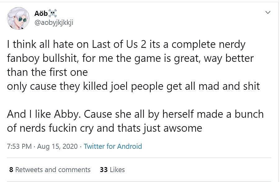 Aöb would also explain that they believe “all hate on Last of Us 2 its a complete nerdy fanboy bullshit.”