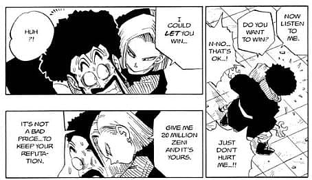 To support her family, she enters the 25th World Martial Arts Tournament where she defeats Mighty Mask. However, in her next match she allows Mr. Satan to defeat her in her return for twice the amount of prize money that she would have gotten if she won the tournament.