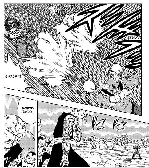 After Goku defeats Saganbo, Moro enters the battlefield and quickly reveals he’s no slouch. In fact, when Android 18 and Android 17 attempt to perform a surprise attack on the villain, he doesn’t even turn to face them. Instead, he just blasts them in the face with his fingers.