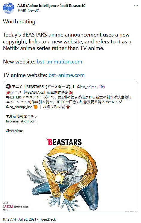 “BEASTARS anime announcement uses a new copyright, links to a new website, and refers to it as a Netflix anime series rather than TV anime,” wrote A.I.R.