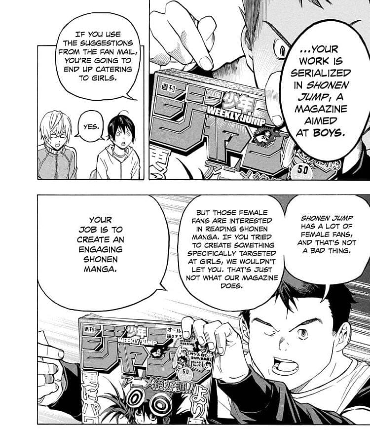 “Shonen Jump has a lot of female fans, and that’s not a bad thing” argues fictional Shonen Jump editor Goro Miura in the series. “Those female fans are interested in reading shonen manga.”