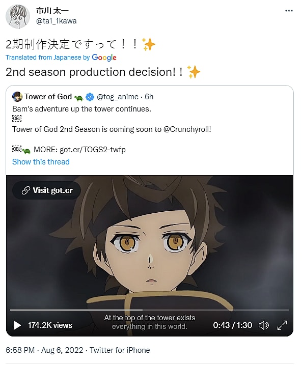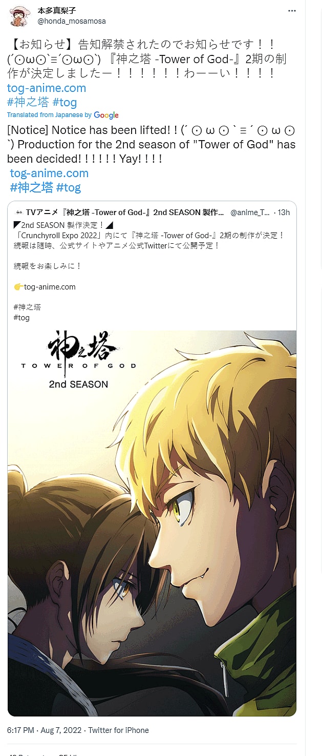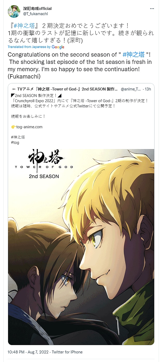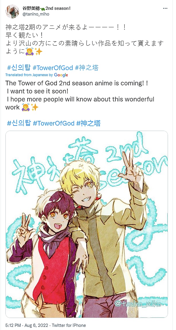 “The Tower of God 2nd season anime is coming!” exclaimed character designer Miho Tanino (translated via DeepL), alongside his sharing of a congratulatory illustration of Bam and Ja. “I can’t wait to watch it!  I hope many more people will get to know this wonderful work!”
