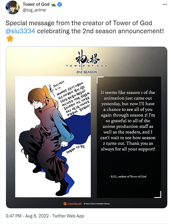 “It seems like season 1 of the animation just came out yesterday, but now I’ll have a chance to see all of you again through season 2!” wrote SIU, as translated by the Official English Tower of God anime twitter account. “I’m so grateful to all of the anime production staff as well as the readers, and I can’t wait to see how season 2 turns out. Thank you as always for all your support!”