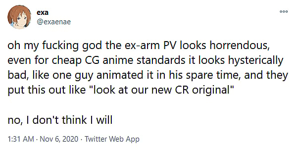 @Exaenae exclaimed that “the ex-arm PV looks horrendous, even for cheap CG anime standards it looks hysterically bad, like one guy animated it in his spare time, and they put this out like “look at our new CR original.”