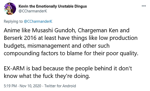 “Anime like Musashi Gundoh, Chargeman Ken and Berserk 2016 at least have things like low production budgets, mismanagement and other such compounding factors to blame for their poor quality,” wrote @CCharmanderK. “EX-ARM is bad because the people behind it don’t know what the f*** they’re doing.”