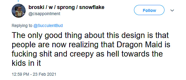 Twitter user Cisappointment wrote, “The only good thing about this design is that people are now realizing that Dragon Maid is f***ing shit and creepy as hell towards the kids in it.”
