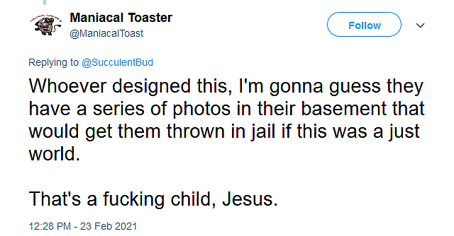 Twitter user ManiacalToast wrote, “Whoever designed this, I’m gonna guess they have a series of photos in their basement that would get them thrown in jail if this was a just world. That’s a f***ing child, Jesus.”