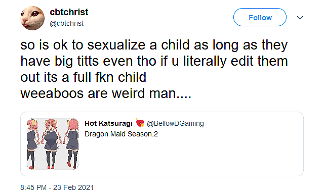 Another wrote, “so is ok to sexualize a child as long as they have big titts even tho if u literally edit them out it a full fkn child weeaboos are weird man….”