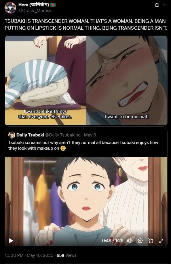 “Tsubaki is [a] transgender woman,” proclaimed @Oracle_Morosis. “That’s a woman. Being a man putting on lipstick is a normal thing. Being transgender isn’t.”