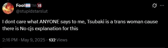 “I don’t care what ANYONE says to me,” declared @stupidstarslut. “Tsubaki is a trans woman cause there is no cįs explanation for this.”