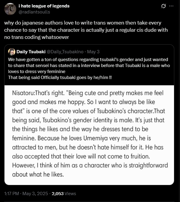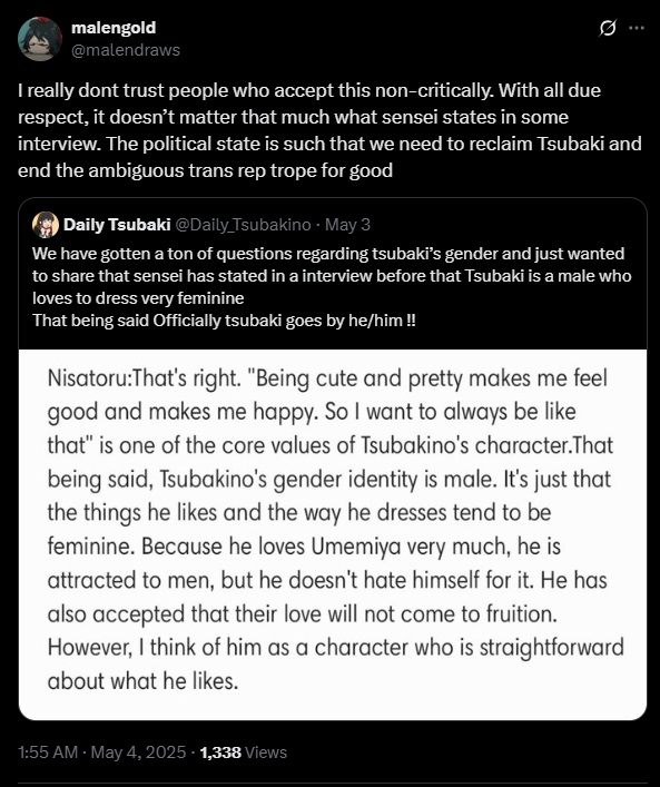 Sharing the same excerpt, @malendraws asserted, “I really don’t trust people who accept this non-critically. With all due respect, it doesn’t matter that much what sensei states in some interview. The political state is such that we need to reclaim Tsubaki and end the ambiguous trans rep trope for good.”