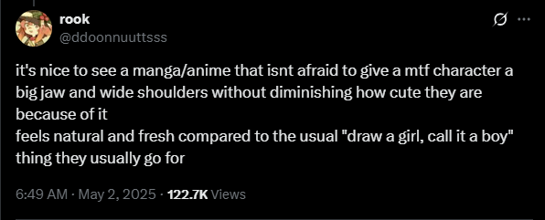 “It’s nice to see a manga/anime that isnt afraid to give a mtf character a big jaw and wide shoulders without diminishing how cute they are because of it,” said @ddoonnuuttsss “feels natural and fresh compared to the usual ‘draw a girl, call it a boy’ thing they usually go for.”