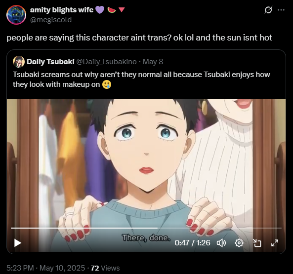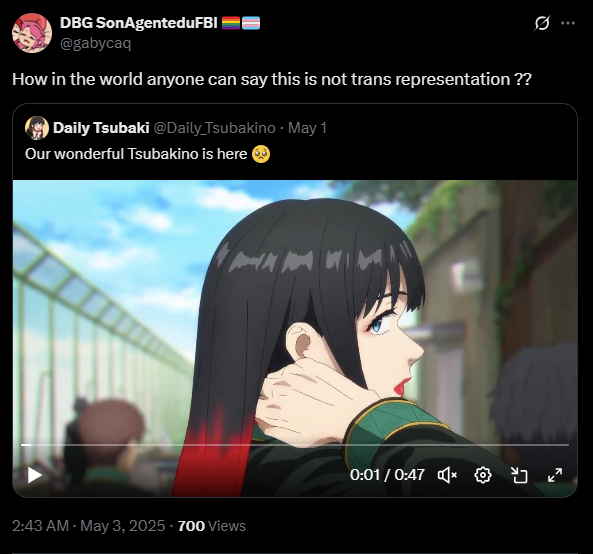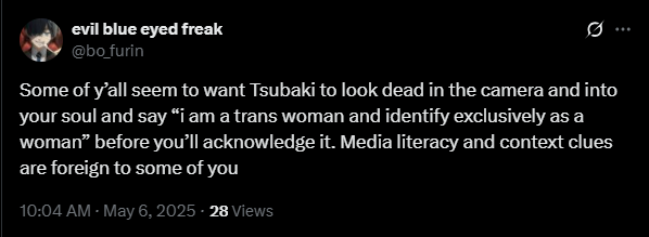 “Some of y’all seem to want Tsubaki to look dead in the camera and into your soul and say ‘I am a trans woman and identify exclusively as a woman’ before you’ll acknowledge it,” @bo_furin bleated. “Media literacy and context clues are foreign to some of you.”