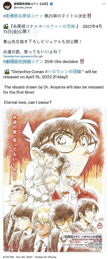 As announced by the film’s official Twitter account on November 30th, the Susumu Mitsuna (Haikyu!) directed, Takahiro Okura (Detective Conan: The Fist of Blue Sapphire) written, and TMS Entertainment (Megalobox) animated Detective Conan: The Bride of Halloween, will hit Japanese theaters on April 15th, 2022.