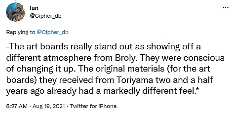 Iyoku also noted that such a large number of visuals were shown during the film’s aforementioned SDCC reveal, especially in comparison to the scarce amount of art shown during DBS: Broly’s announcement, “because the visuals this time really express the key elements of the film and are different from anything that’s come before.”