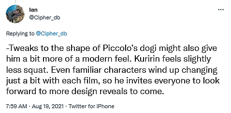 “Tweaks to the shape of Piccolo’s dogi might also give him a bit more of a modern feel,” Iyoku reportedly continued. “Kuririn feels slightly less squat. Even familiar characters wind up changing just a bit with each film, so he invites everyone to look forward to more design reveals to come.”