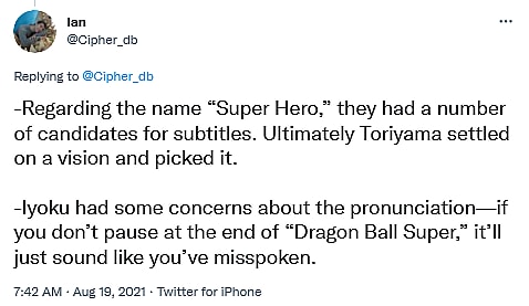“You have to take care to enunciate both ‘Dragon Ball Super’ and ‘Super Hero,’” said Iyoku. “Like the winding Super Saiyan God Super Saiyan before it, it’s truly a Toriyama name.”
