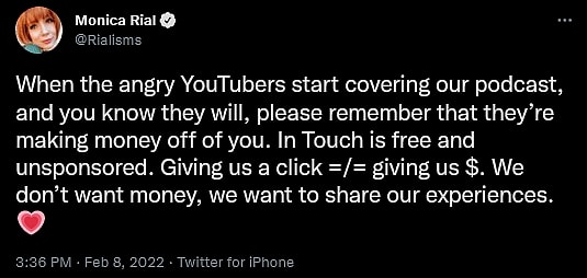 Shortly after word of her podcast’s premiere began to circulate across social media, Rial tweeted, “When the angry YouTubers start covering our podcast, and you know they will, please remember that they’re making money off of you.”