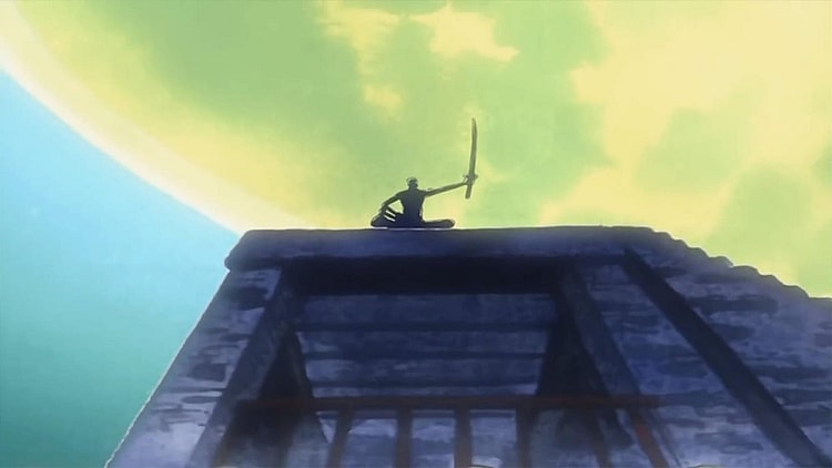 After the introduction to Windmill Village, this offhand scene is played out, with the audience meeting Zoro at a “Mountaintop Shrine” where he is approached by Mr. 7 and subsequently proceeds to kill the Baroque Works member in battle.
