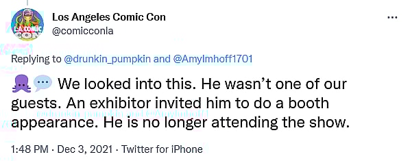 The official LA Comic Con Twitter account responded to Imhoff, strangely by way of replying to multiple other users who had commented on her initial tweet, and assured her that they had “looked into this.”