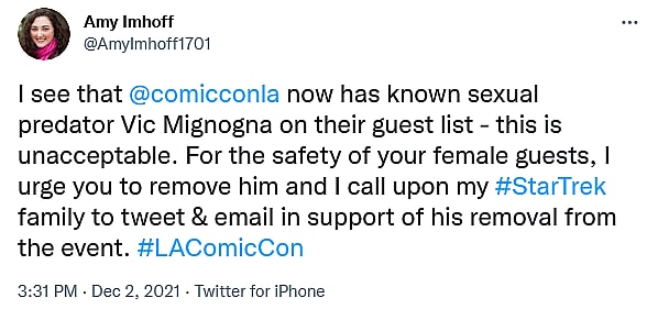 “For the safety of your female guests, I urge you to remove him and I call upon my #StarTrek family to tweet & email in support of his removal from the event. #LAComicCon” added Imhoff,