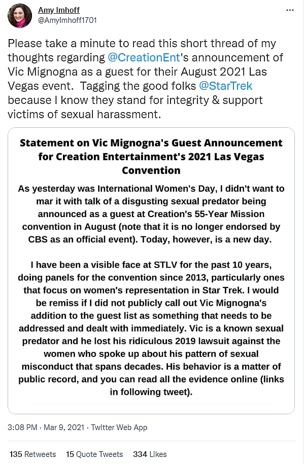 Back in March, Imhoff went after Creation Entertainment’s Star Trek convention. She wrote on Twitter, “Please take a minute to read this short thread of my thoughts regarding Creation Entertainment’s announcement of Vic Mignogna as a guest for their August 2021 Las Vegas event.”