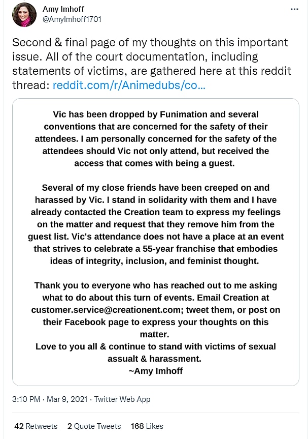She then shared another image of her statement, which says, “Vic has been dropped by Funimation and several conventions that are concerned for the safety of their attendees. I am personally concerned for the safety of the attendees should Vic not only attend, but received the access that comes with being a guest.”