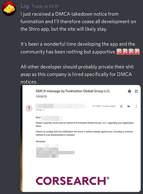 “It’s been a wonderful time developing the app and the community has been nothing but supportive,” added Lag in a Discord screenshot shared to the /r/animepiracy subreddit, before warning, “all other developers should probably private their s–t asap as this company is hired specifically for DMCA notices.”