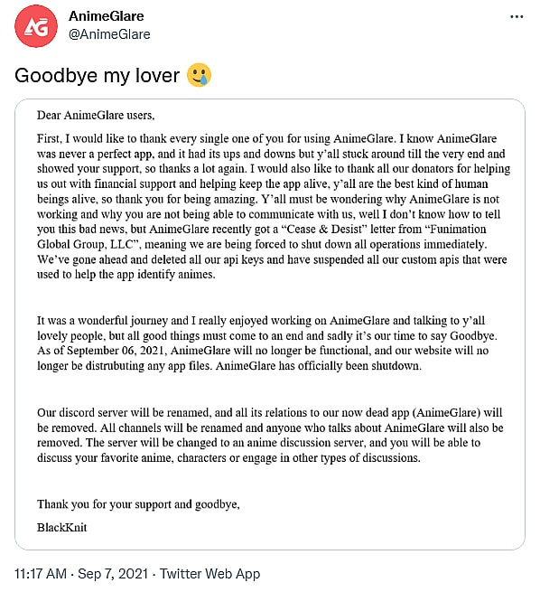 “It was a wonderful journey and I really enjoyed working on AnimeGlare and talking to y’all lovely people, but all good things must come to an end and sadly it’s our time to say Goodbye,” wrote project leader BlackKnit. “As of September 06, 2021, AnimeGlare will no longer be functional, and our website will no longer be distributing any app files.”
