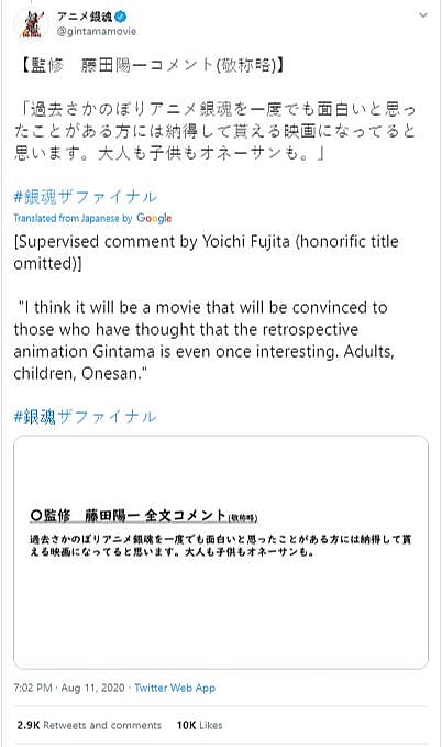 The film will be supervised by Yoichi Fujita. In a translation provided by Google, he stated, “I think it will be a movie that will be convinced to those who have thought that the retrospective animation Gintama is even more interesting. Adults, children, Onesan.”