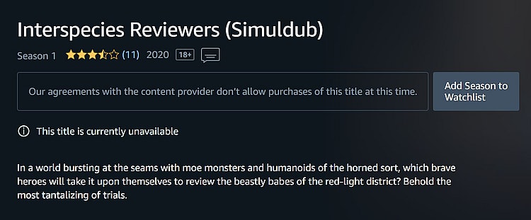 The attack on Interspecies Reviewers continues. Can confirm that both the dub and sub versions have now been pulled from both the Amazon store as well Prime Video. More fuel on the already raging dumpster fire that is FUNimation. @_Hero_Hei_ @YellowFlashGuy @BoundingComics pic.twitter.com/kZA1SgI0ez