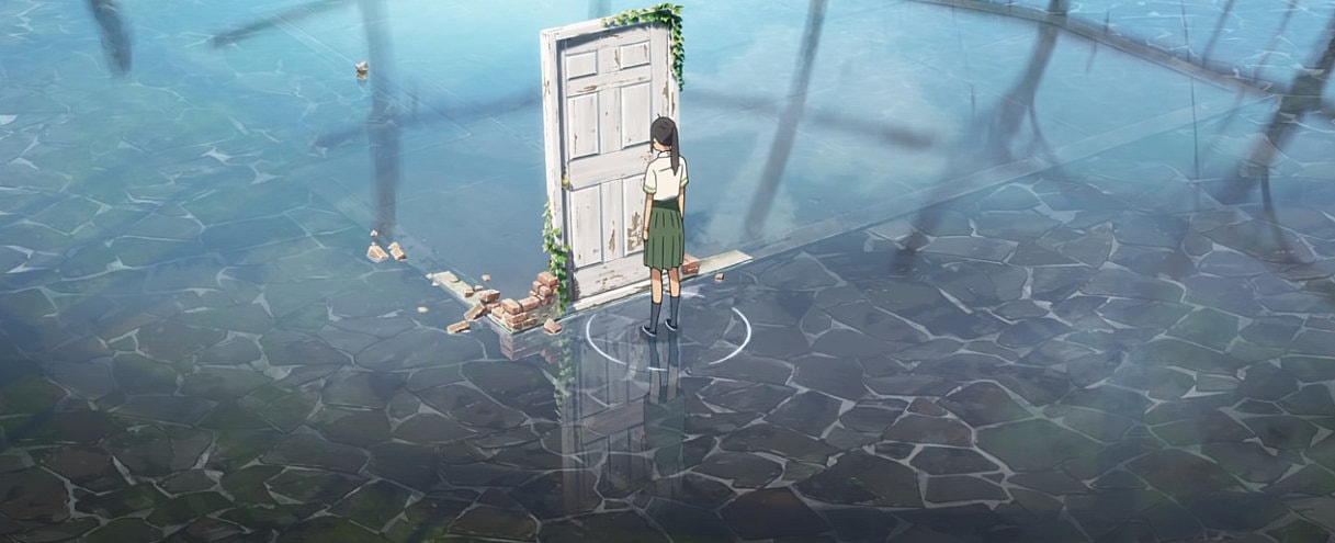 Suzume eventually discovers a weather door standing upright in the midst of the ruins of the town. She eventually grabs the door’s knob and opens the door.